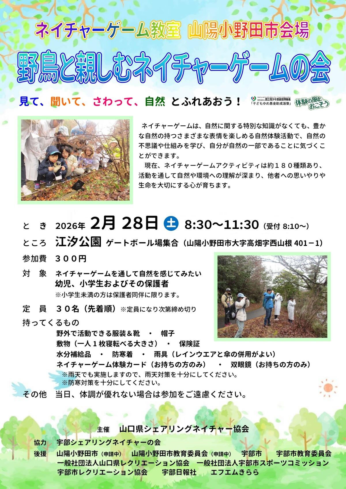 | 持ち物 | 野外で活動できる服装&靴、帽子、敷物(一人1枚寝ころべる大きさ)、保険証、水分補給品、雨具(傘とレインウエア併用がよい)、双眼鏡(お持ちの方)、ネイチャーゲーム体験カード(お持ちの方) |