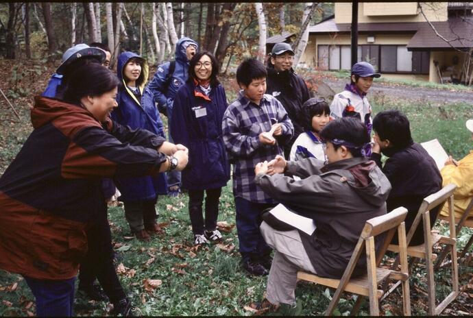 〈きこりの親方〉も元々は別の名称で応募された活動でした。実践審査は軽井沢の森で行われました。質問する役を、当時アクティビティ審査員であられた日本体育大学の故・小泉先生もやりました。がっしりした体格でまじめな顔をするとちょっと迫力。