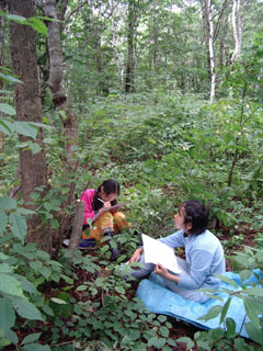 次は、森の家作りのために切った木の切り株と、1人1人じっくりと向き合って対話するネイチャーゲーム |