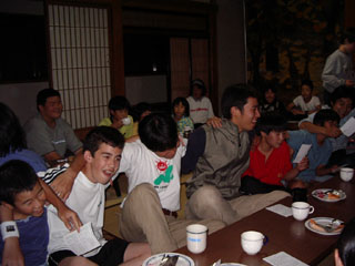 みんなで肩を組んで歌い、笑い、最後の夜はふけていきました。 |